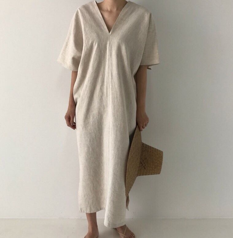 ワンピース レディース 麻 麻混 リネン Vネックワンピース 半袖ワンピース スリット