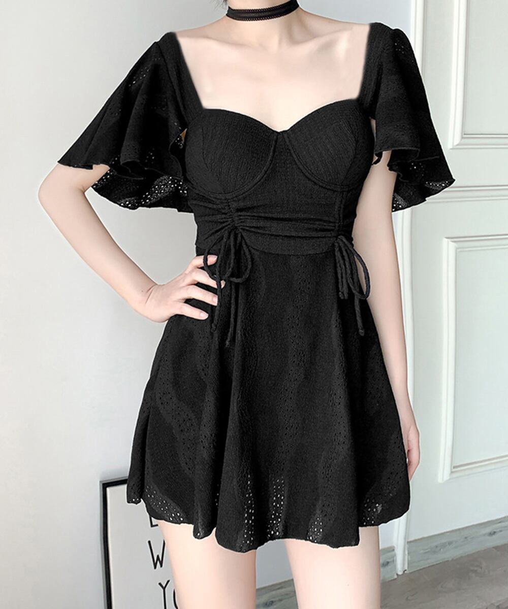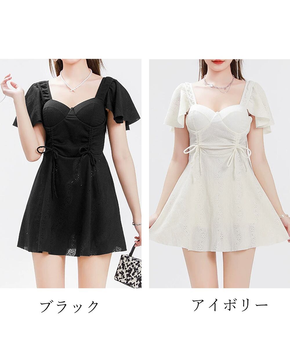 フリル袖フレアワンピース水着 着やせ 大人可愛いレース水着 ハイウエス露出控えめ水着 お洒落ビーチウェア 清楚上品韓国風