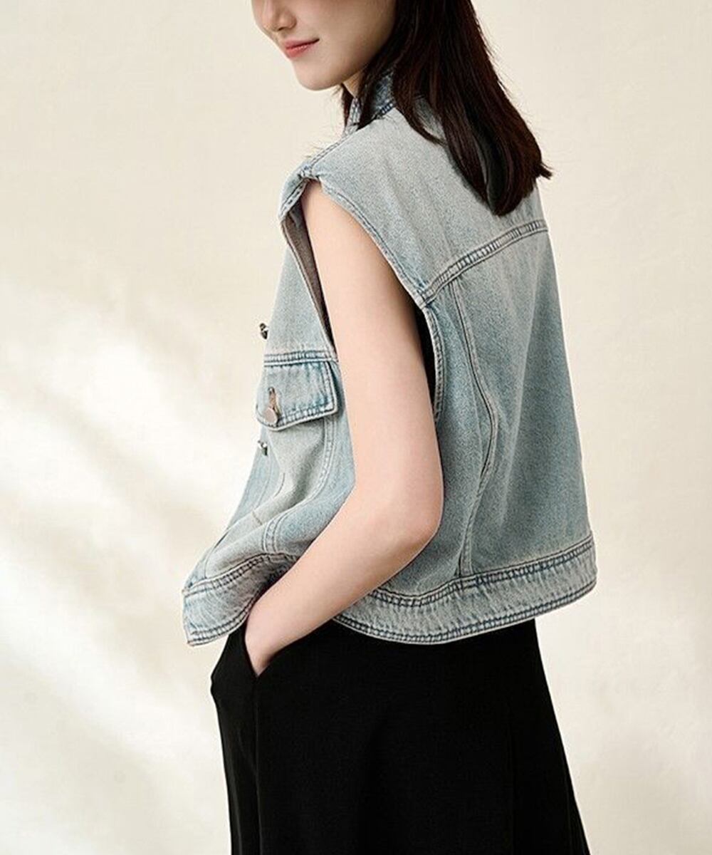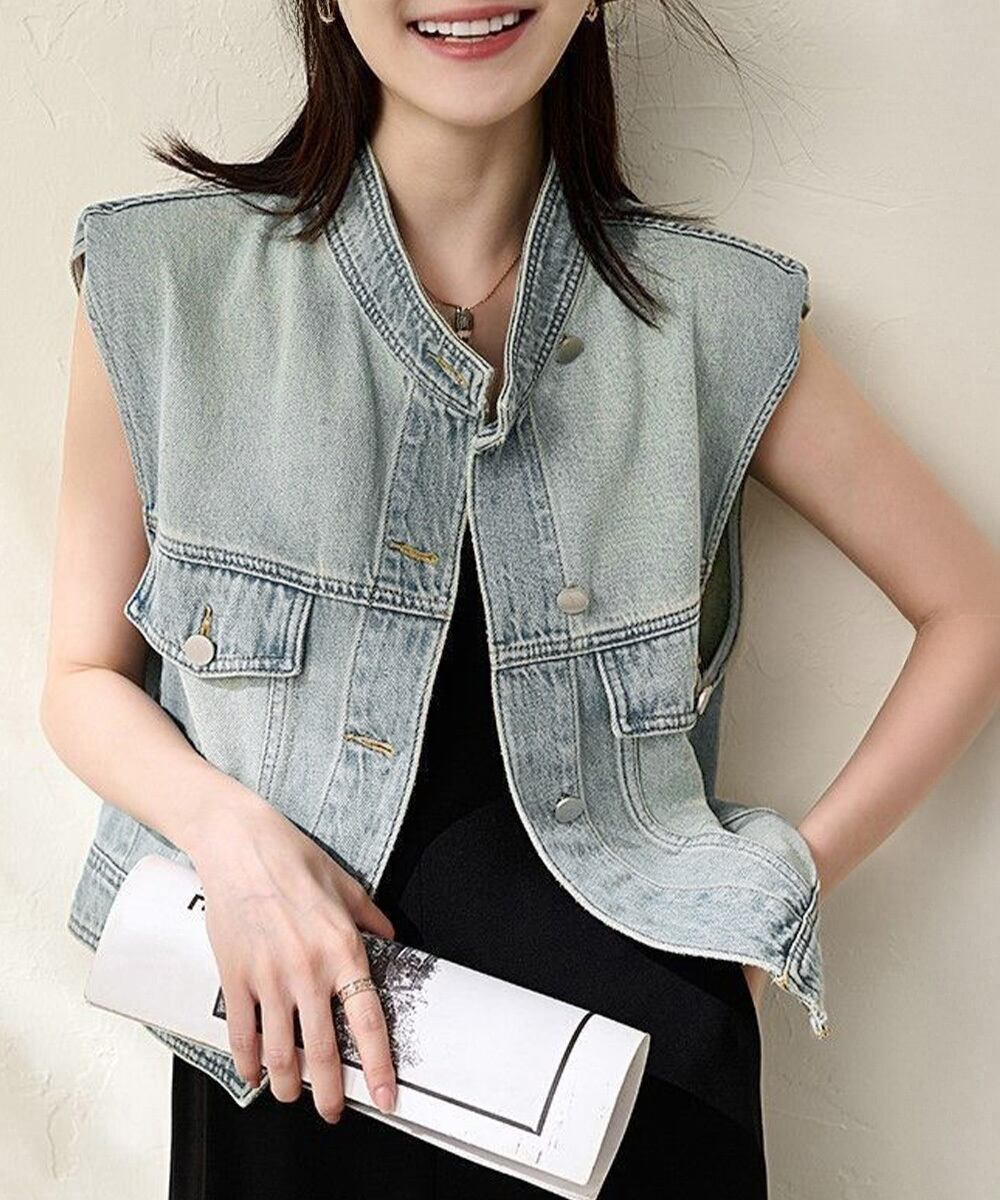 スタンドカラー デニムジャケットノースリーブ 体型カバー ゆったりデニムジレ 肩パッド入り レトロ韓国風カジュアルジレ