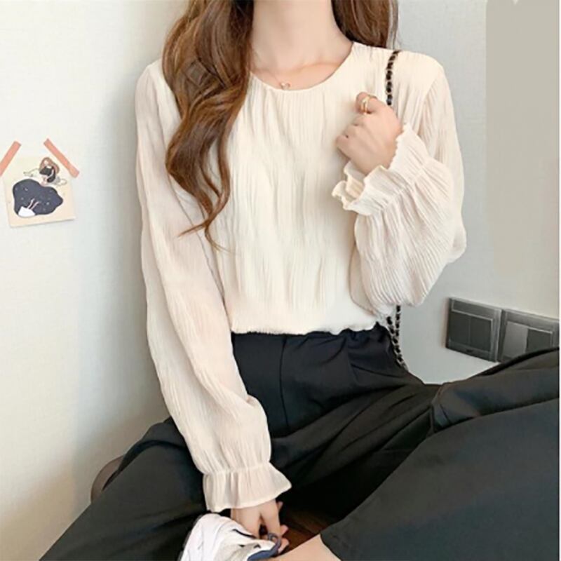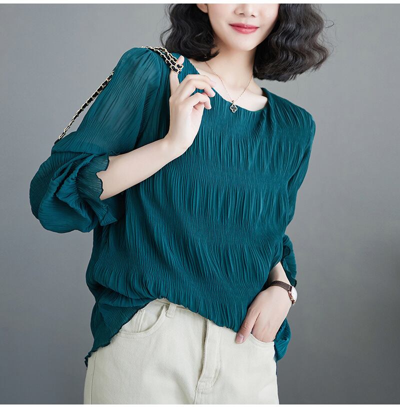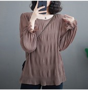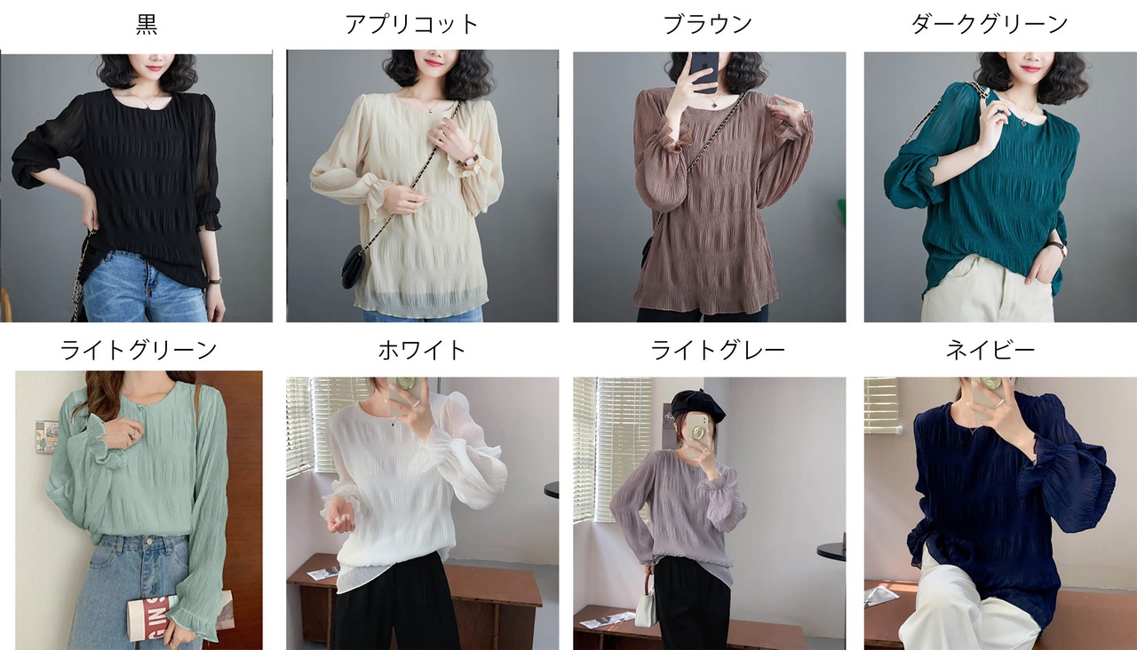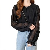 シャーリング シアーブラウス ラウンドネック 長袖 レディース きれいめ